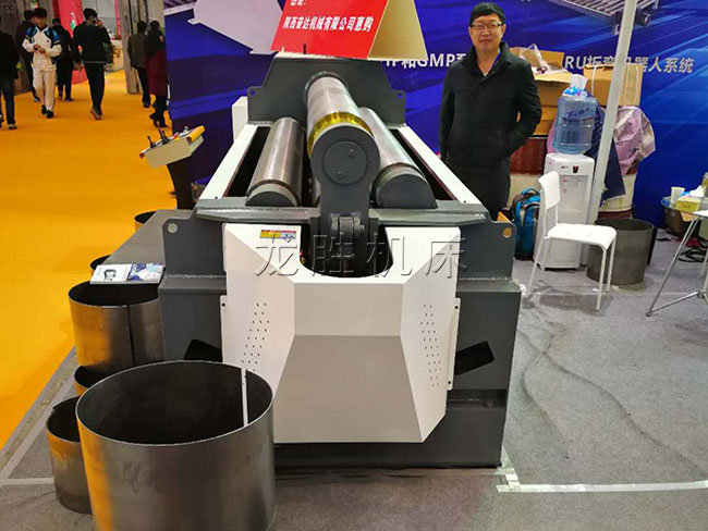該機結構型式四輥式,上輥為主傳動,通過減速機的輸出齒輪與上輥齒輪嚙合,為卷制板材提供扭矩;下輥作垂直升降運動,通過液壓缸內的液壓油作用于活塞而獲得,以便夾緊板材,為液壓傳動;在下輥的兩側設有側輥并沿著機架導軌作傾運動,通過絲桿絲母蝸輪蝸桿傳動;該機優點是板材端部預彎及卷圓可以在同一臺設備上進行。
