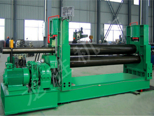 該機結構型式為三輥對稱式,上輥在兩下輥中央對稱位置作垂直升降運動,通過液壓缸內的液壓油作用于活塞而獲得,為液壓傳動,兩下輥作旋轉運動,通過減速機的輸出齒輪與下輥齒輪嚙合,為卷制板材提供扭矩。